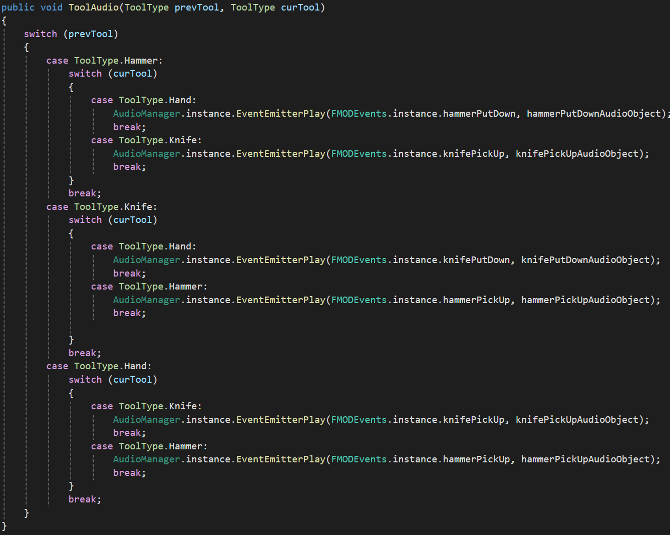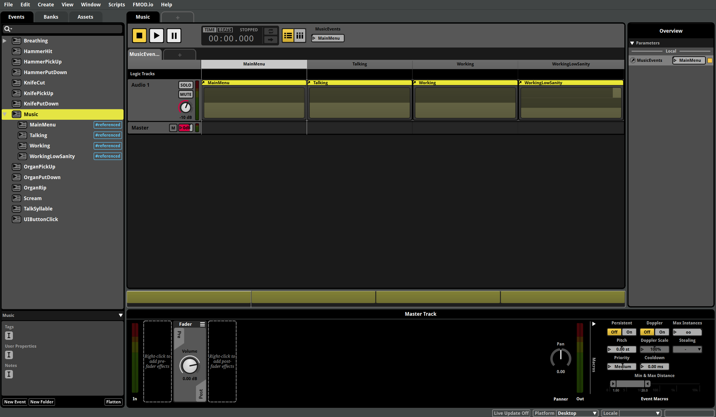 Worked alongside programmers to set up Github and coded triggers for various sound effects and dynamic music cues for different parts of the game.